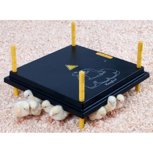 Heating plate for chicks that provides gentle warmth. Chicks shelter under it as they would under their mother's wing.