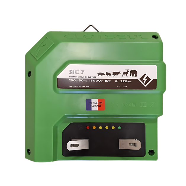 The SIC 15 model from Clotseul integrates U.B.I. (Ultra Low Impedance) technology to effectively manage very long fences, even in the presence of dense vegetation. With a voltage of 15,000 volts and stored energy of 30 Joules, it can electrify fences up to 400 kilometers long. This energizer offers unmatched performance, automatically adjusted by a microprocessor to ensure optimal efficiency under all circumstances.