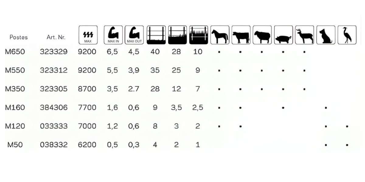 Pour les très grandes installations, le M650 offre une énergie maximale de 6,5 joules, couvrant jusqu'à 40 km de clôture.