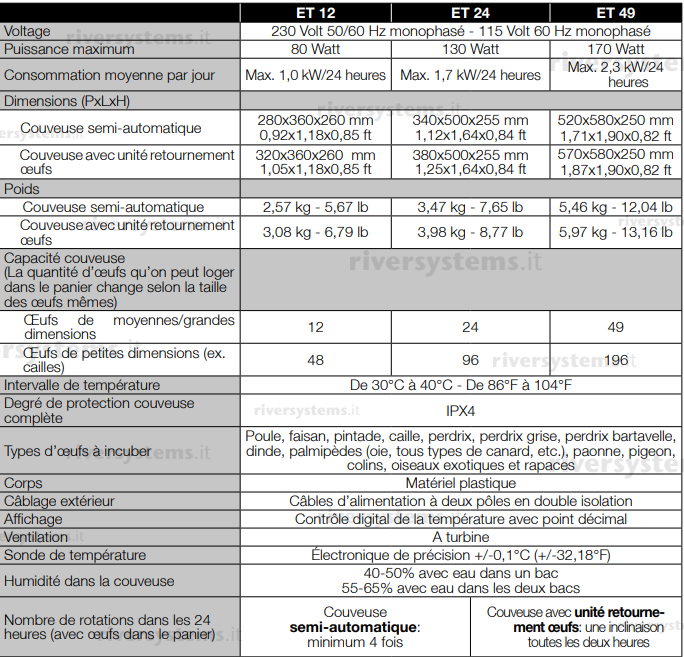 Terwagne Elevage biedt u digitale broedmachines voor 12, 24 en 49 eieren aan, ontworpen om verschillende soorten eieren uit te broeden; het zijn professionele broedmachines die eenvoudig en direct te gebruiken zijn en tegelijkertijd zeer betrouwbare technische innovaties bieden. Ze zijn dus geschikt voor zowel beginners als fokkers van kleine en middelgrote omvang.