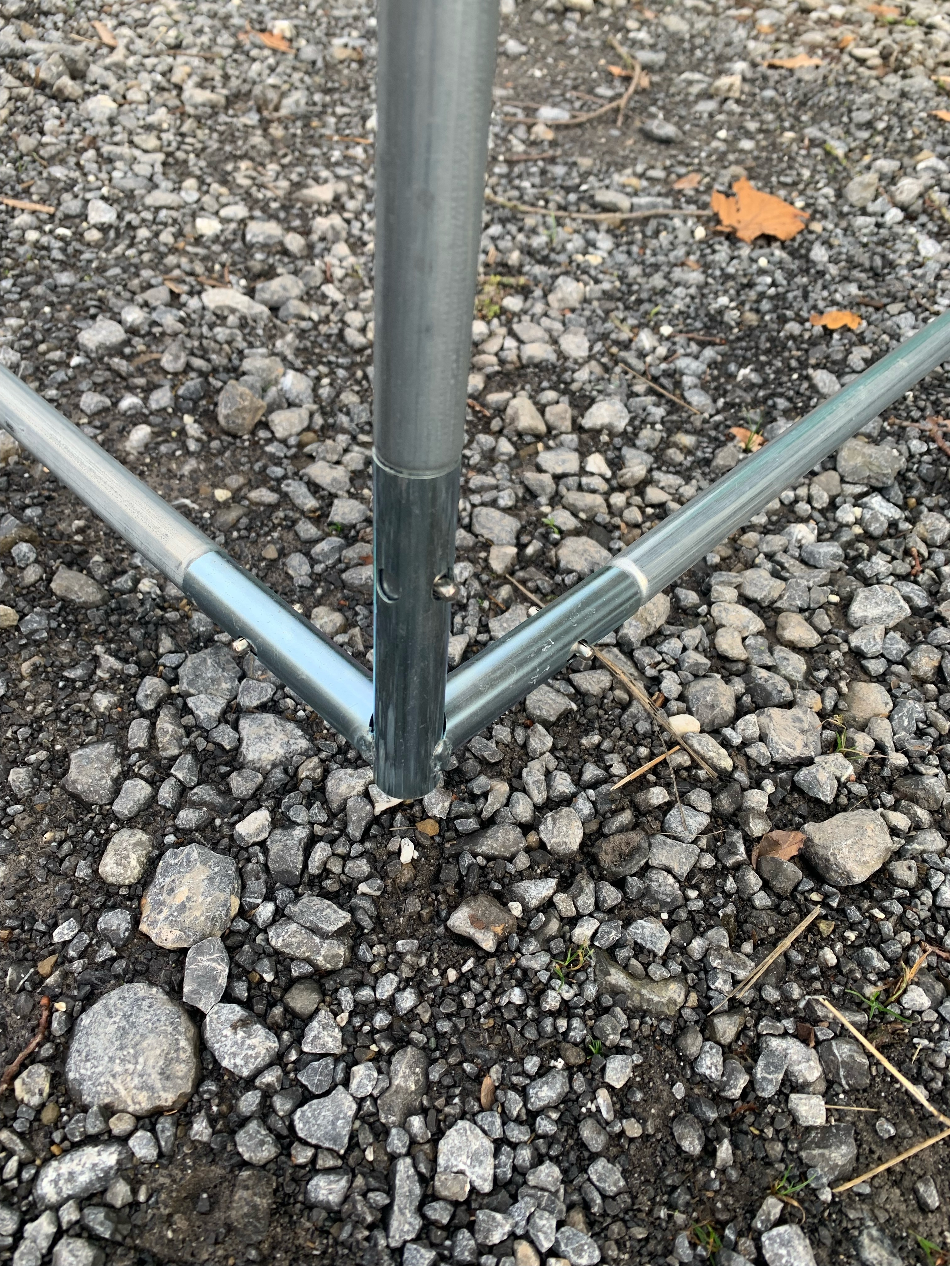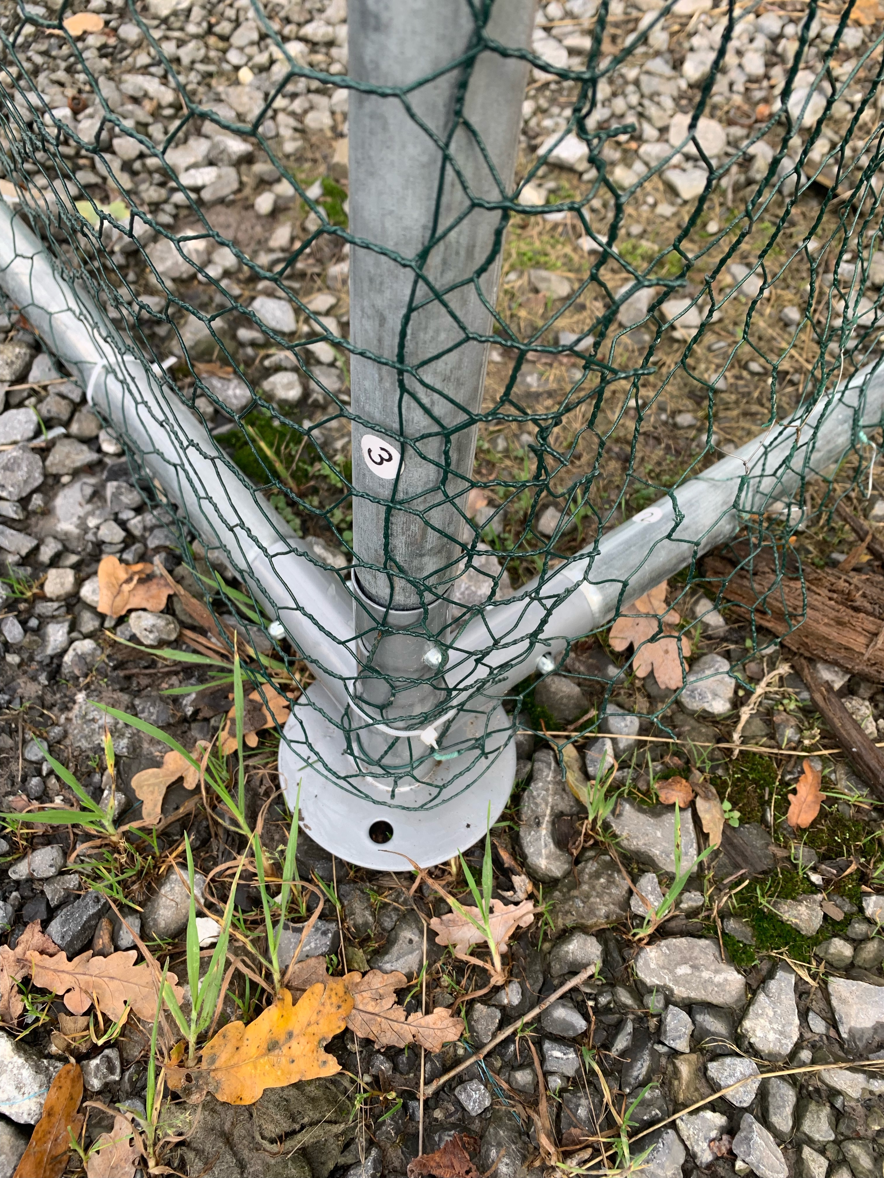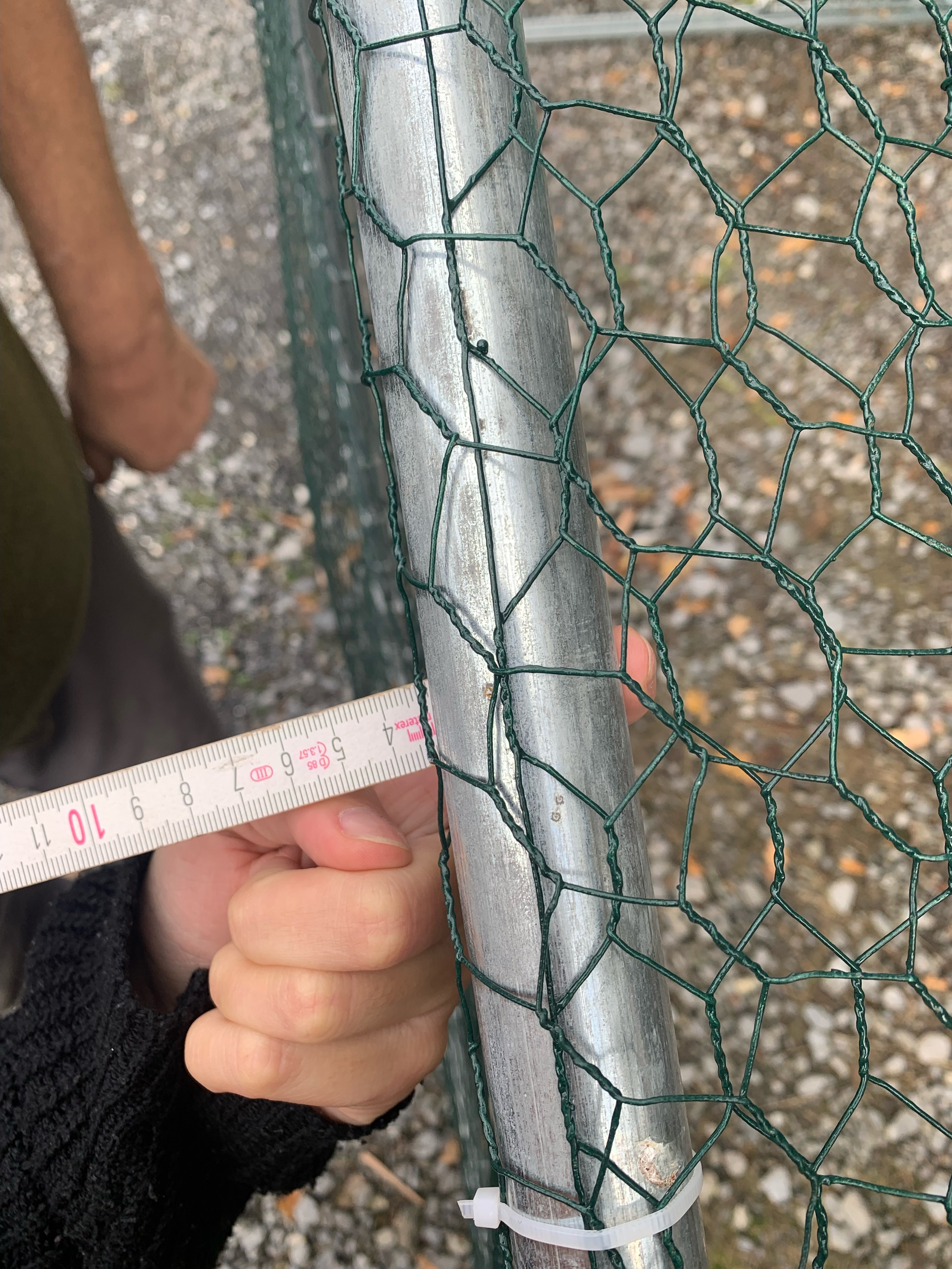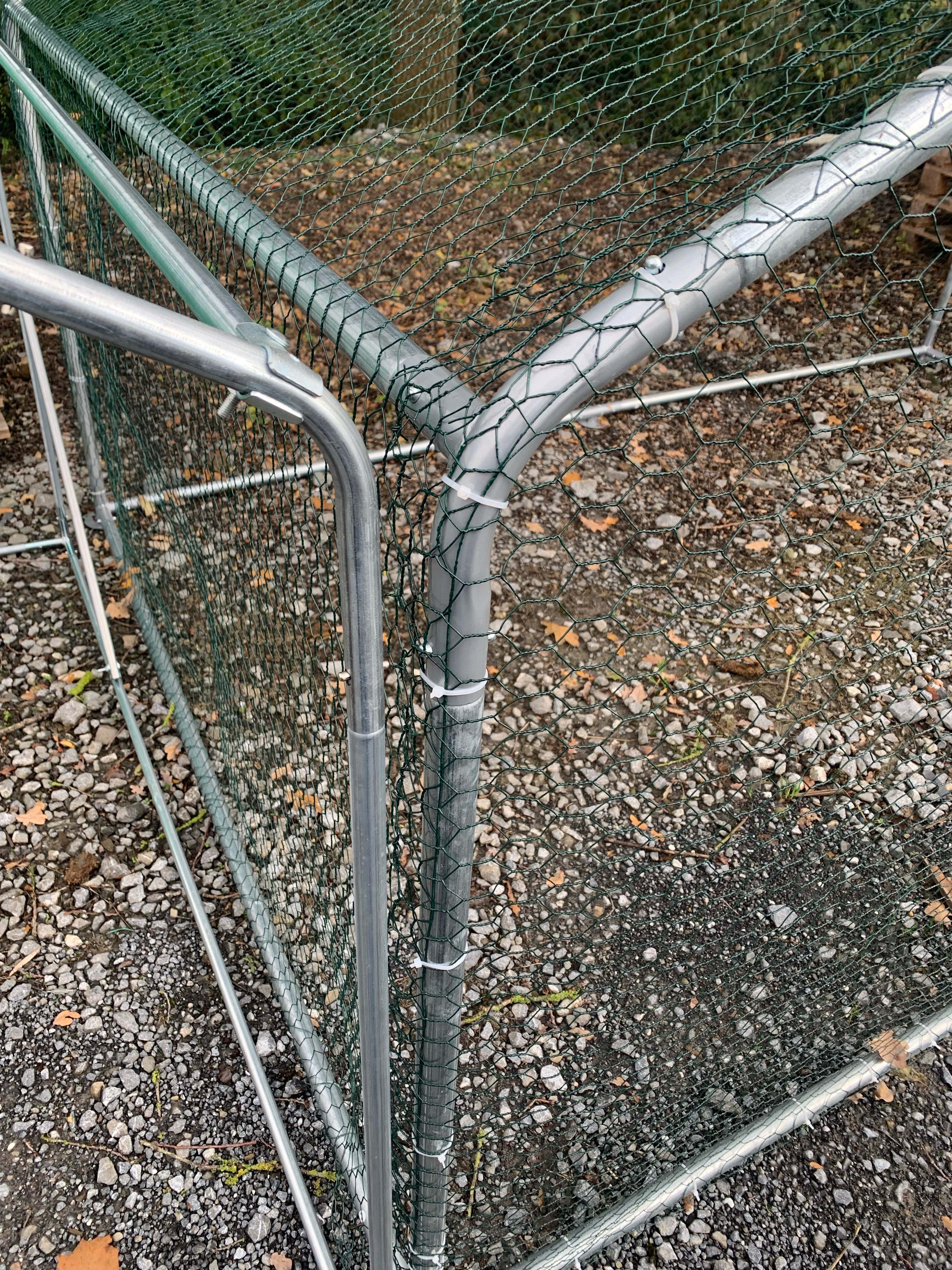 Het ontwerp maakt een eenvoudige montage mogelijk, zelfs door één persoon. Het is eenvoudigweg een kwestie van het verbinden van de onderdelen van de structuur met elkaar om de omheining te vormen en vervolgens het gaas aan deze structuur te bevestigen met kabelbinders rond de vier metalen palen die de hoeken van de omheining vormen.