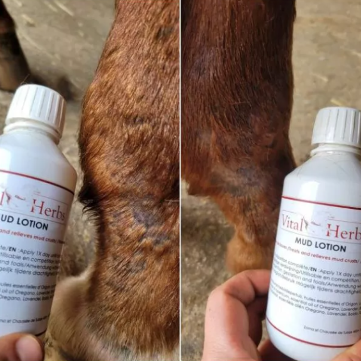 De Mud Lotion van Vital'Herbs is een 100% natuurlijke oplossing die speciaal is samengesteld om de huid van paarden die blootgesteld zijn aan vochtige en modderige omgevingen te verlichten en te beschermen. Dankzij een synergie van plantaardige en essentiële oliën bevordert deze verzorging de huidregeneratie en bestrijdt het effectief bacteriën, schimmels en andere pathogenen die verantwoordelijk zijn voor de modderkruis, de bacteriële of schimmelachtige ringworm.